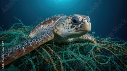 © mat, Obraz premium Turtle entangled in plastic pollution underwater scene