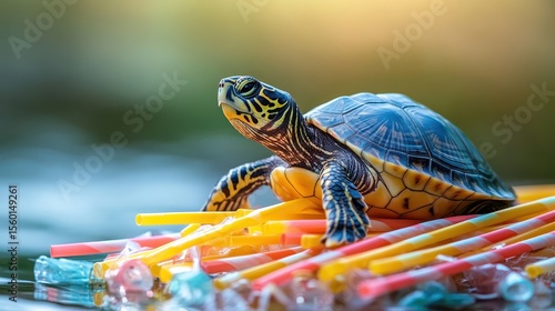 © Abba, Fototapeta premium Turtle floats on plastic straws in a polluted river environment. Illustrates the devastating impact of pollution on aquatic wildlife.