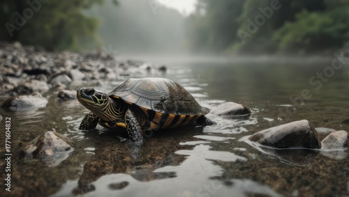 Fototapeta premium Turtle in the river, a serene moment in natures embrace.