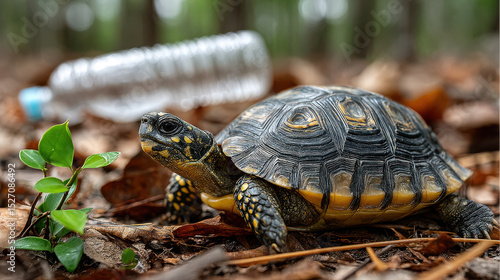 Obraz premium Turtle navigates forest floor with discarded plastic bottle highlighting...