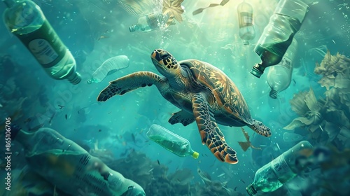 Fototapeta premium Turtle Navigating Underwater Amidst Discarded Plastic Bottles