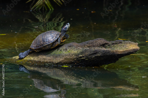 Fototapeta premium Turtle on a log in a florida swamp with a mirrored reflection
