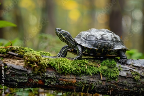 © diwek, Obraz premium Turtle on a Moss Covered Branch