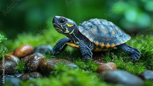 Obraz premium Turtle on bed of grass and rocks, close up with foreground rocks and trees in...