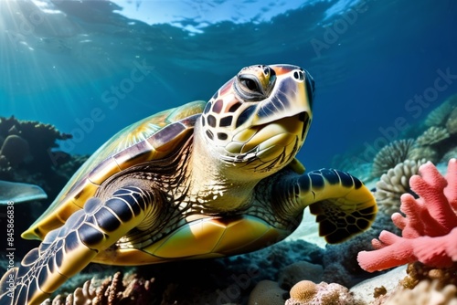 Fototapeta premium Turtle on the background of a coral reef.