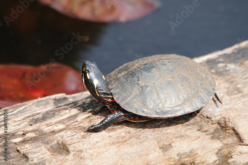 © Aline, Obraz premium Turtle Painted Photo. Painted turtle on a log in the pond with lily pads displaying its turtle shell, head, paws in its environment and surrounding. Image. Portrait. Picture.