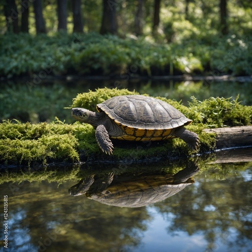 © Saeed Ahmad, Obraz premium Turtle Resting on a Log in a Pond. Turtle in the pond.