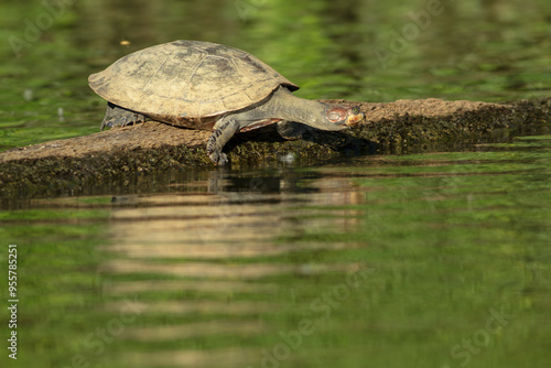 © christian vinces, Fototapeta premium Turtle resting on a log in a serene green water setting.