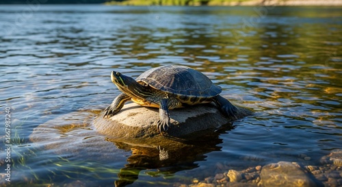 Fototapeta premium Turtle resting on a rock in the water sunlit natural habitat