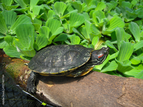 © SiestaPixel, Obraz premium Turtle resting on log near green water plants