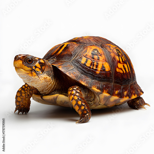 © Basit, Obraz premium Turtle’s Grace: A close-up shot of a box turtle, showcasing the beautiful patterns of its shell and focused expression, offering a glimpse into the gentle life of this reptile.