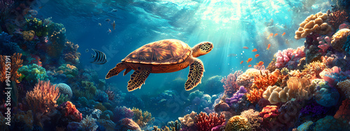 Fototapeta premium Turtle's Tranquil Swim in the Reef