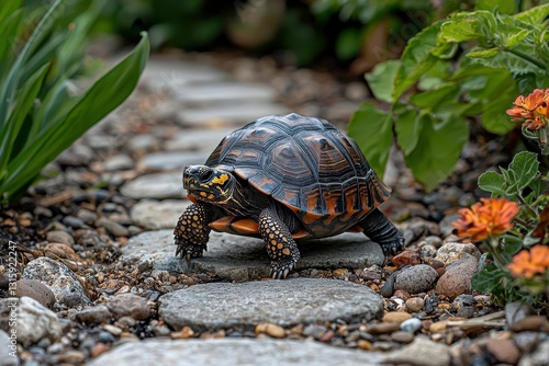 Fototapeta premium Turtle Slowly Navigating Through a Garden Path