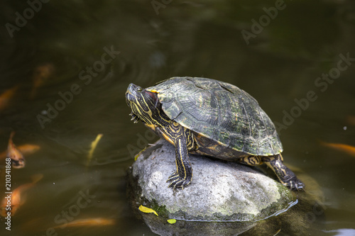 Fototapeta premium Turtle sunbathing on rock in the middle of a pond, close up