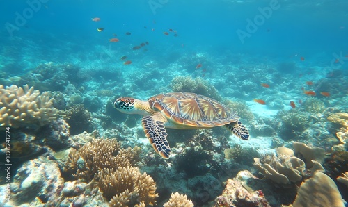 © simba kim, Naklejka premium Turtle swimming among coral , Generative AI