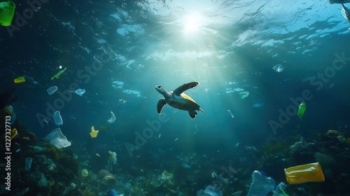 Fototapeta premium Turtle swimming amongst floating plastic waste in ocean pollution scene