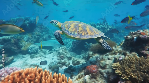 © Markus, Obraz premium Turtle swimming in the wide open blue ocean.