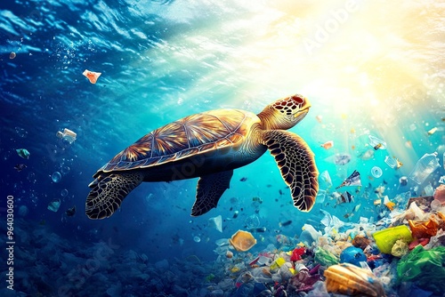 © Wan, Obraz premium Turtle swimming through ocean pollution.