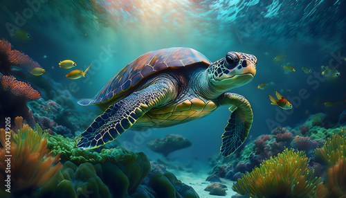 Fototapeta premium Turtle swimming underwater, underwater world