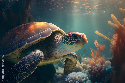 Fototapeta premium turtle under the sea created using AI Generative Technology