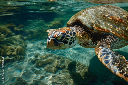 © Tanu, Fototapeta premium Turtle, Underwater wildlife panorama Coral reef with wild sea turtles , AI generated