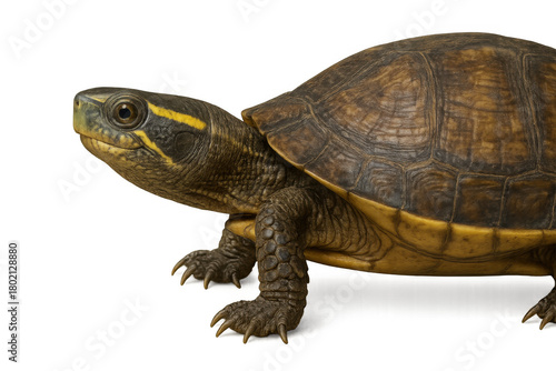 Obraz premium Turtle walking, displaying brown shell and yellow stripes, isolated on a...