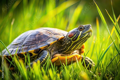 © sanom, Fototapeta premium Turtle Walking in Grass - Side View Portrait Photography