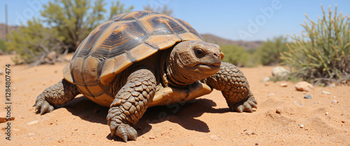 Fototapeta premium Turtle walking on sandy terrain under the bright sun, showcasing its distinctive shell patterns and rugged texture, surrounded by sparse desert vegetation