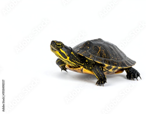 Obraz premium Turtle with distinctive yellow stripes on its head and neck, isolated against a stark white background
