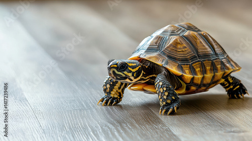 Obraz premium turtle with patterned shell slowly crawls across wooden floor, showcasing its...
