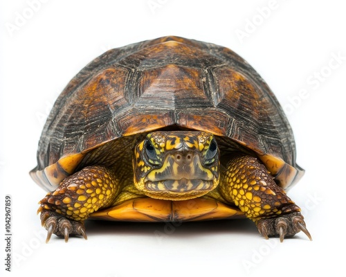 Fototapeta premium Turtle with vibrant shell colors, white isolated background.