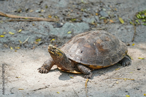 Fototapeta premium Turtle with yellow stripes on the head.