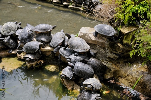 Fototapeta premium Turtles. A large family of turtles near a pond, sit on each other. Sigean safari park, France.