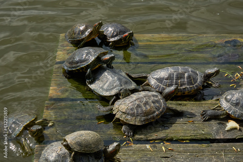 Fototapeta premium Turtles basking in the sun on a wooden platform in the water.