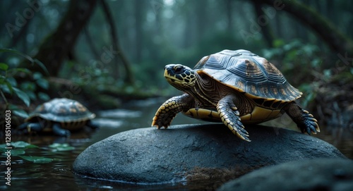 © TheWaterMeloonProjec, Fototapeta premium Turtles in a woodland setting, foraging for food or a mate, one turtle perched on a rock.