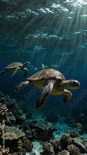 Fototapeta premium turtles navigating through coral reefs deep underwater background