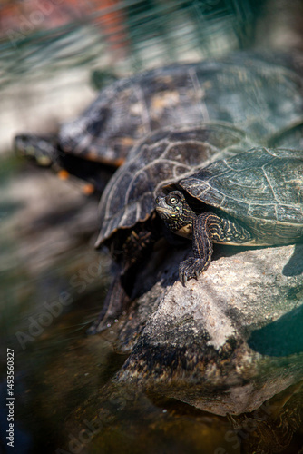 Fototapeta premium Turtles resting on a rock at a wildlife sanctuary, captured in natural daylight. Peaceful moment in animal conservation environment.
