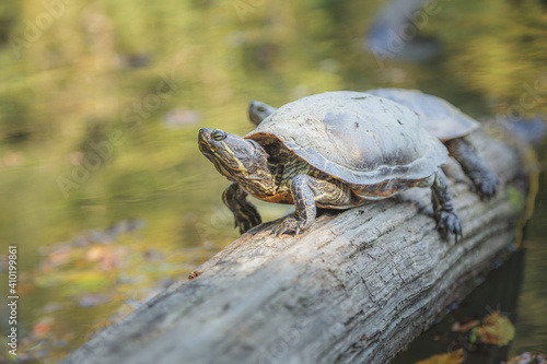 © Stephen, Obraz premium Turtles (Trachemys scripta) play on a log in Park Maksimir, the Croatian capital city of Zagreb. Turtles have become widespread after being released as pets. There are approximately 300 in Park Maksim