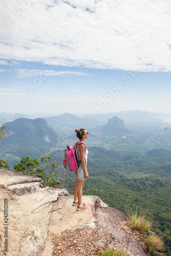 Obraz premium Turysta kobieta relaks na szczycie góry i podziwianie widoków