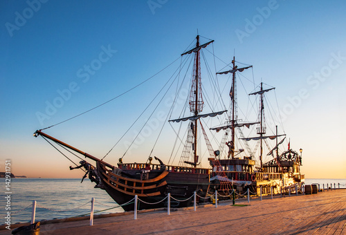 © nahlik, Fototapeta premium Turystyczny statek piracki na molo (molo) w Sopocie, w świetle wschodu słońca