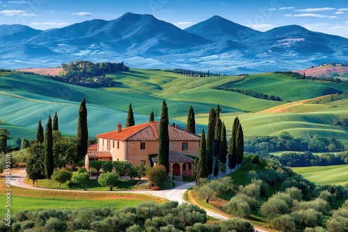 Fototapeta premium Tuscan farmhouse among rolling green hills and cypress trees under a blue mountain sky