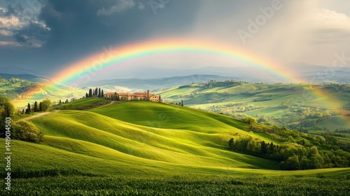 Obraz premium Tuscan Rainbow Landscape: A Serene Vista of Rolling Hills and a Majestic...