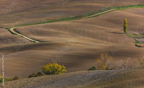 Fototapeta premium Tuscan rolling hills with curving dirt road and lone tree in autumn, Italy.