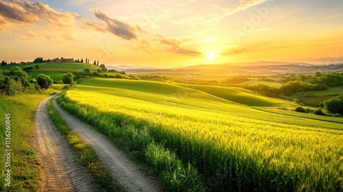 Fototapeta premium Tuscan Sunset: Golden Fields and Rolling Hills