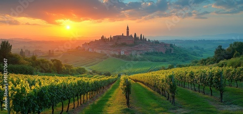 © Muamanah, Naklejka premium Tuscan Sunset: Vineyards and Medieval Town at Golden Hour