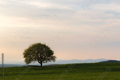 Obraz premium Tuscany landscape, with an isolated tree in a green meadow, beneath a warm...