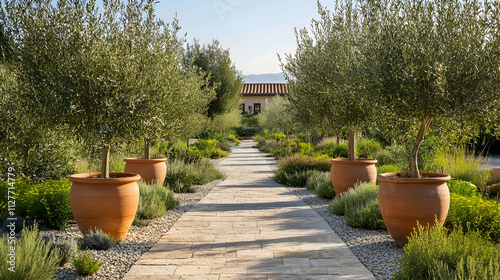 Obraz premium Tuscany Mediterranean garden with olive trees and stone pathways, rustic...
