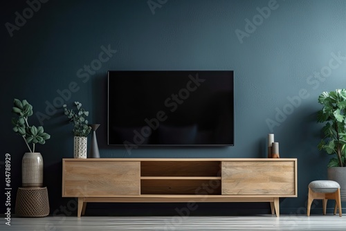 © Lasvu, Fototapeta premium TV cabinet with sparse decorating on a background of a dark blue wall. Generative AI