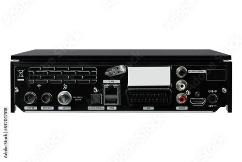 © h368k742, Obraz premium Tv decoder rear view isolated on white background. Receiver