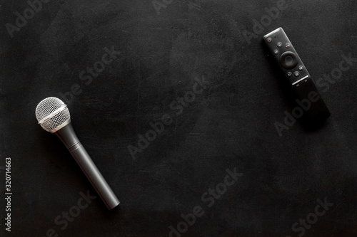 Naklejka premium TV news concept. TV remote and microphone on black background top-down copy space